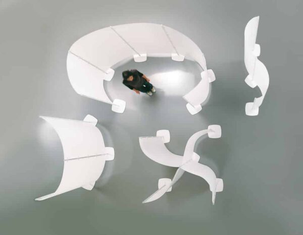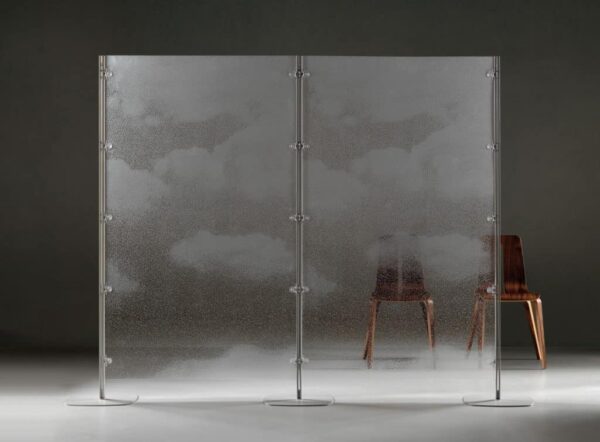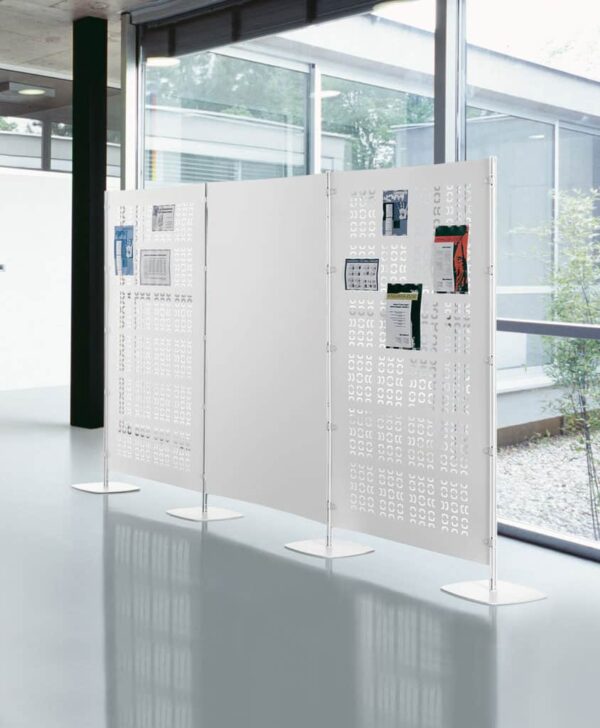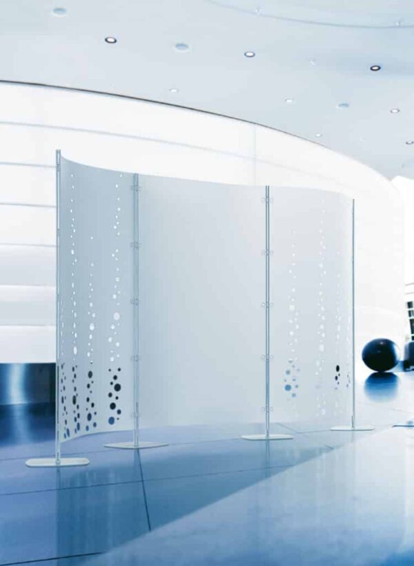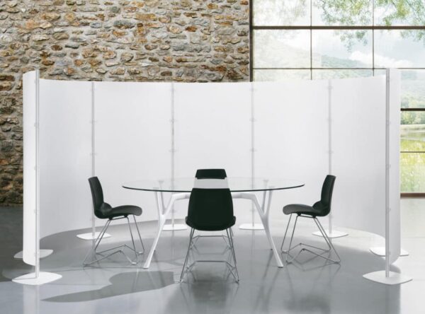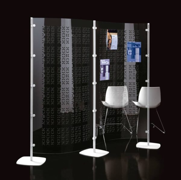 Arianna es un sistema expansible de mamparas flexibles. Los paneles van fijados a los montantes a través de soportes fijos o magnéticos especiales que permiten acoplar y desacoplar rápidamente el panel.
