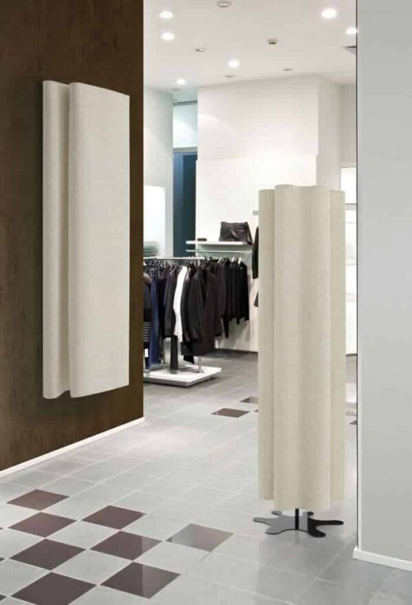 Diesis y Bemolle son elementos fonoabsorbentes realizados con estructuras de soporte de acero y telas fabricadas con tecnología Snowsound Fiber. Estos“objetos”, en la parte superior, tienen unos bastidores de acero para drapear la tela que cae con pliegues precisos y estratificaciones concebidas para optimizar el rendimento acústico.