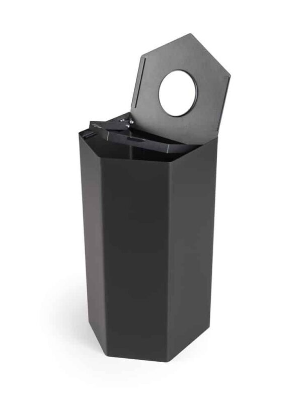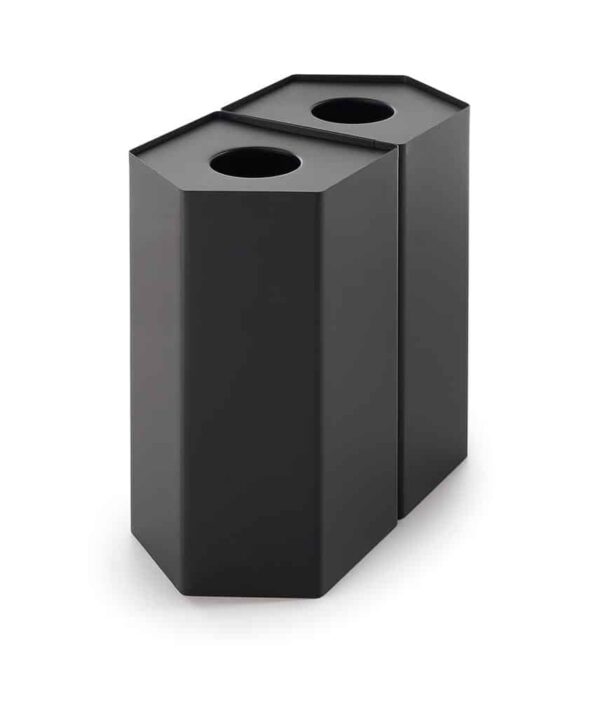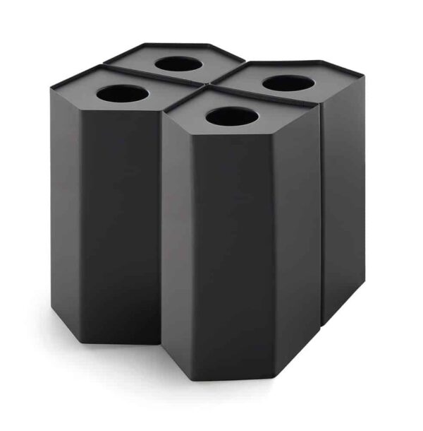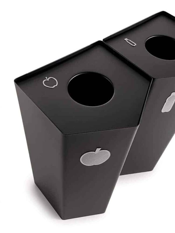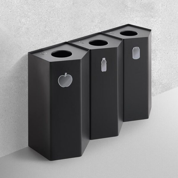 Contenedor en forma pentagonal realizado en acero barnizado con polvos epoxi. Destaca la modularidad con la que el elemento permite organizar la recogida selectiva de residuos.