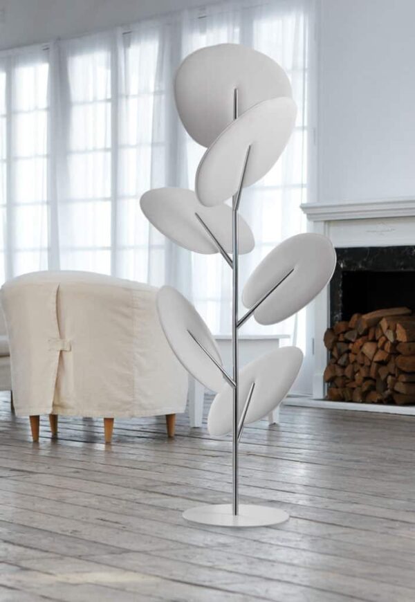 El sistema de elementos fonoabsorbentes Botanica está compuesto por un panel en forma de hoja sujeto por un soporte en metal cromado que puede fijarse con distintas inclinaciones y se propone en combinación con distintas estructuras de soporte.