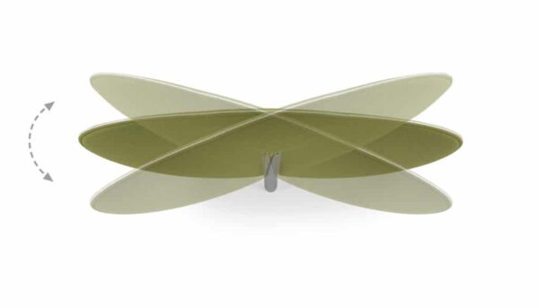 El sistema de elementos fonoabsorbentes Botanica está compuesto por un panel en forma de hoja sujeto por un soporte en metal cromado que puede fijarse con distintas inclinaciones y se propone en combinación con distintas estructuras de soporte.
