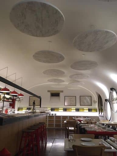 Al ser un elemento acústico suspendido, presenta el doble de área de material de absorción que un panel acústico común, lo que lo convierte en una solución muy efectiva para lugares con techos altos. La altura mínima de instalación de las nubes es de 500 mm y el máximo es de 1180 mm desde el techo.