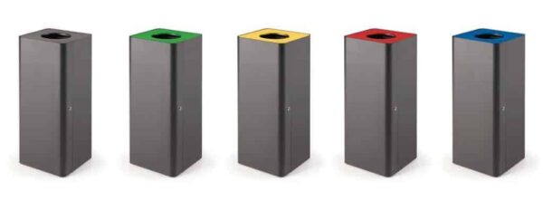 Papelera concebida para la recogida selectiva de residuos y realizada íntegramente en acero barnizado con polvos epoxi. La parte delantera funciona como una puerta que permite una apertura completa para acelerar y simplificar las operaciones de vaciado y sustitución de la bolsa. Dispone de cerradura y llave para garantizar que la apertura se realice solo por parte del personal autorizado.