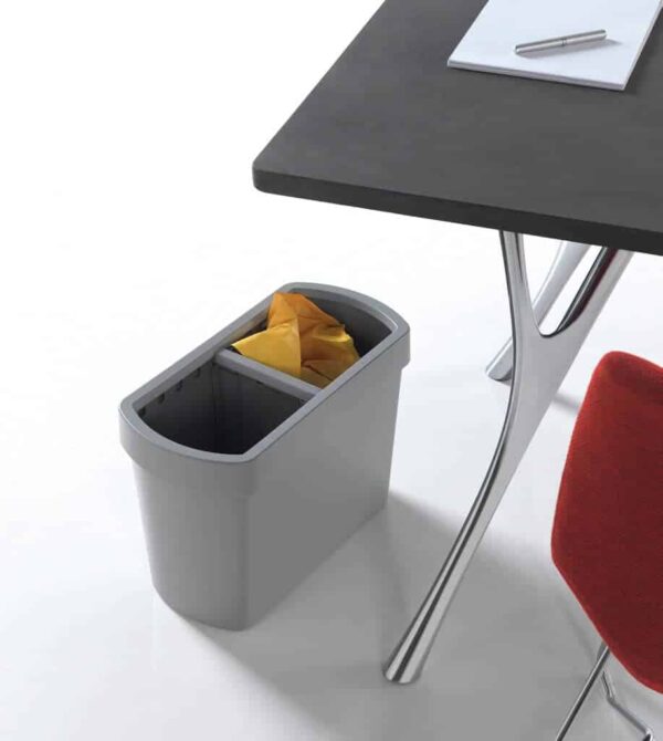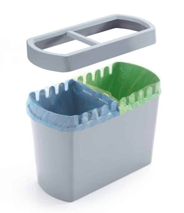Cesto completamente de tecnopolímero para la separación de residuos. Se suministra con un divisorio interno y la correspondiente sujeción superior de serie. Estos pueden encajarse libremente, pudiendo así obtener los espacios con la capacidad necesaria.