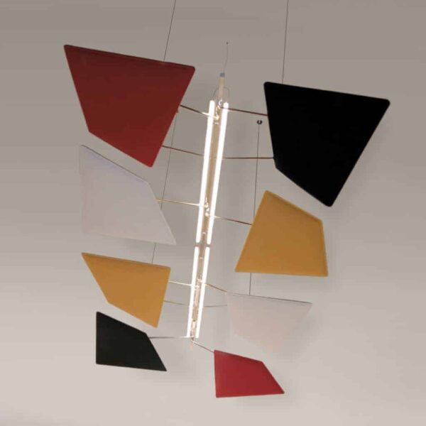 El bastidor de acero cromado del techo está equipado con brazos móviles, a los que se aplican los paneles Flap mediante articulaciones esféricas. Los bastidores son modulares y se pueden colocar conectándolos en batería. Los paneles se pueden girar e inclinar para crear configuraciones planas, cóncavas o convexas conforme a las necesidades estéticas y acústicas.