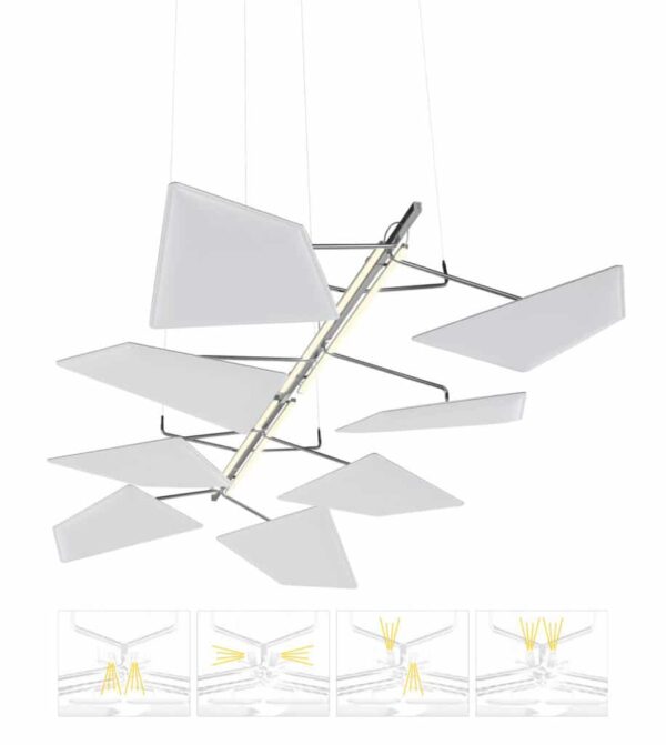 Los paneles Flap llevan en la parte posterior un placa de acero cromado conectada trámite una articulación esférica a un brazo de acero cromado que se puede instalar directamente el bastidor del techo.