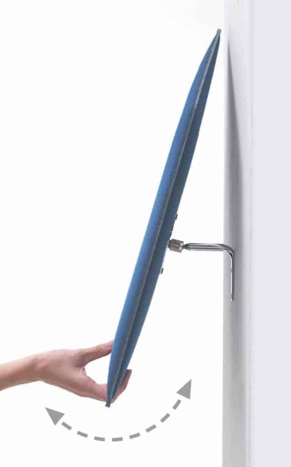 Los paneles Flap llevan en la parte posterior un placa de acero cromado conectada trámite una articulación esférica a un brazo de acero cromado que se puede instalar directamente en la pared o en el techo. Gracias a la articulación esférica el panel puede girar 360° y inclinarse en todas las direcciones para personalizar tanto los aspectos estéticos del producto como también la calibración acústica.