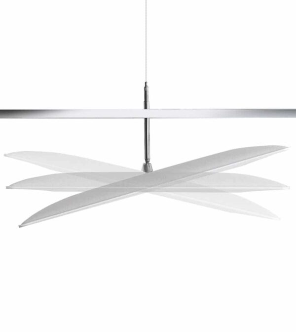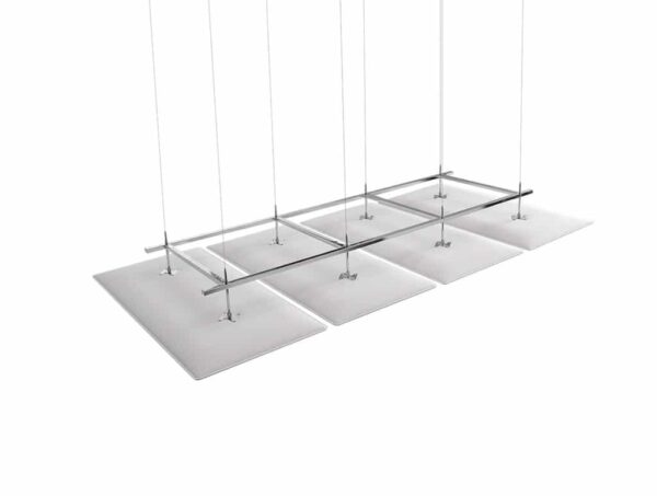 Sistema fonoabsorbente modular, con paneles que incorporan la tecnología Snowsound. Con sus líneas limpias y sus múltiples posibilidades de configuración, permite crear soluciones elegantes y funcionales, tanto para espacios grandes como pequeños. El bastidor modular es de acero cromado y permite albergar paneles que se fijan a la estructura mediante empalmes articulados. Los paneles se pueden colocar en sentido horizontal o inclinados sobre su eje mayor. De esta forma es posible crear interesantes configuraciones tridimensionales. El sistema consta de cables de regulación en altura. La inclinación de los paneles no solo da lugar a variadas configuraciones estéticas sino que, cuando es necesario, permite mejorar la ventilación y el paso de la luz.