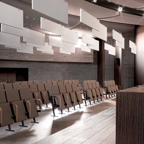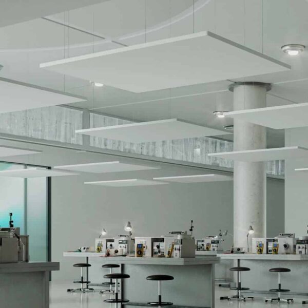 Línea de paneles fonoabsorbentes con elevadas prestaciones acústicas (clase A de absorción acústica) específicamente diseñados para formar parte de proyectos de gran escala en los ámbitos educativo, comercial e industrial. Realizados en poliéster en densidad variable, no poseen revestimiento exterior y están dotados de soportes que permiten su fijación al techo, así como su colocación en suspensión con cables o en la pared.