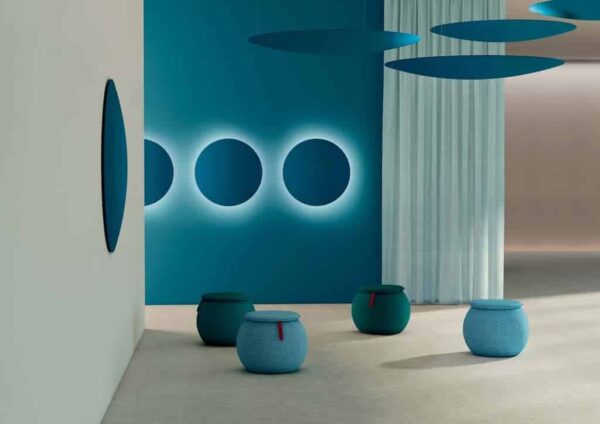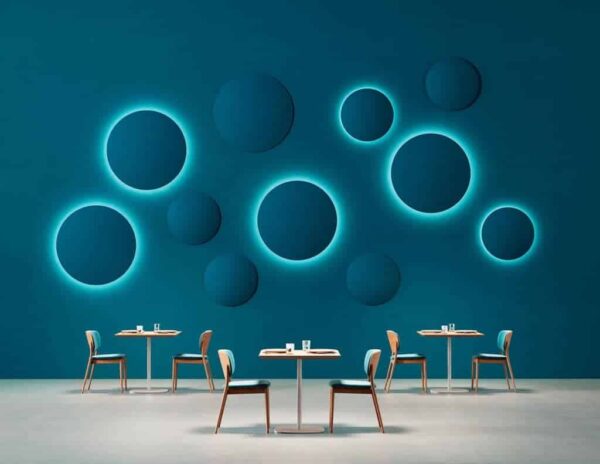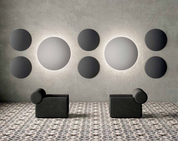 Paneles fonoabsorbentes de forma redonda y convexa, que pueden ser bien colocados en la pared, adhiriéndose a la misma, a una distancia de 5 cm, o colgados del techo mediante 3 cables regulables en altura. Pueden complementarse con iluminación LED indirecta, sumando así la función de cuerpo luminoso a la de la corrección acústica. El panel de pared con luz LED crea un efecto de iluminación indirecta (wall washing).