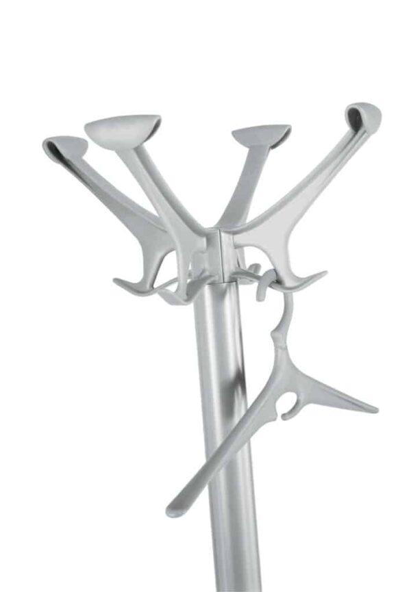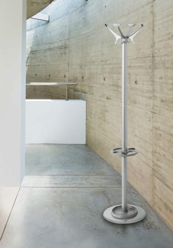 Perchero de pie con estructura en acero recubierto con polvos epoxídicos. Cabezas en tecnopolímero. Aro paragüero y cubeta recoge aguas exportables en tecnopolímero.