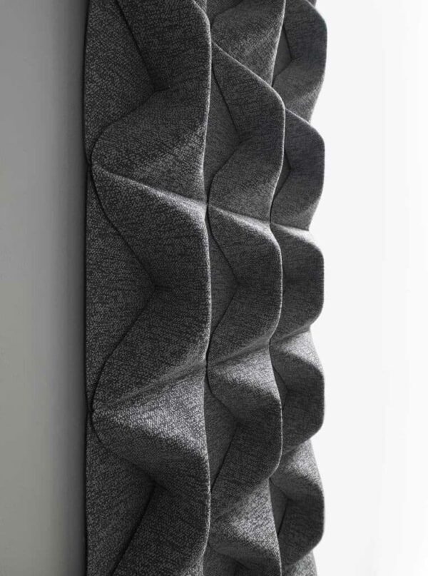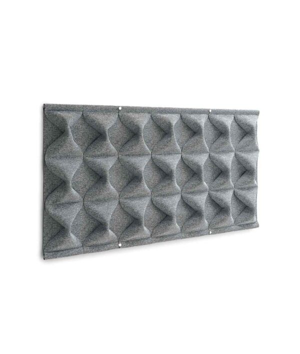 Elemento fonoabsorbente de pared en poliéster tapizado con tejido Snowsound-Fiber 8 Bouclè. Las formas, que se obtienen mediante clips de acero inoxidable, evocan el movimiento de las dunas de arena, sinuosas y fluctuantes. Hasta la acentuada textura del tejido que lo compone evoca la infinidad de granos de arena de las dunas. Este sistema se fija a la pared mediante un sólido estribo de acero pintado. Para otorgarle rigidez, en la parte superior e inferior del panel se introducen dos tubos de acero que se bloquean por medio de unos tornillos cromados especiales.
