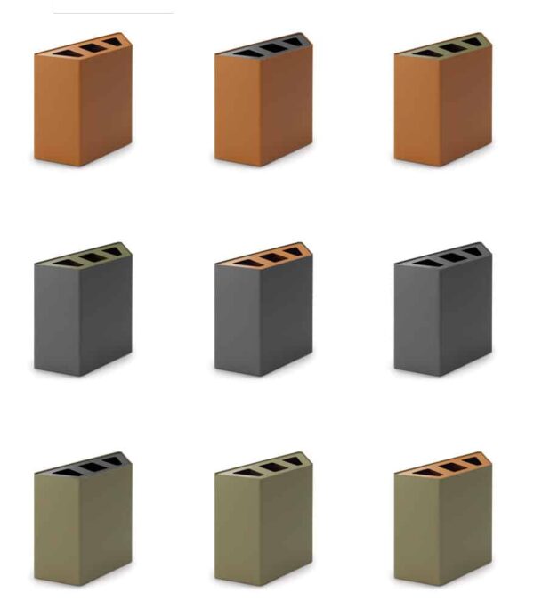 Contenedor de acero barnizado con polvos epoxi. Su peculiar geometría permite situarlo tanto cerca de la pared, de manera que pasa prácticamente desapercibido, como en configuraciones formadas por varios elementos para crear “islas” dedicadas a la recogida selectiva de residuos. Tres tonalidades diferentes enriquecen los matices cromáticos, jugando también con las tapaderas disponibles en colores combinados o en contraste.