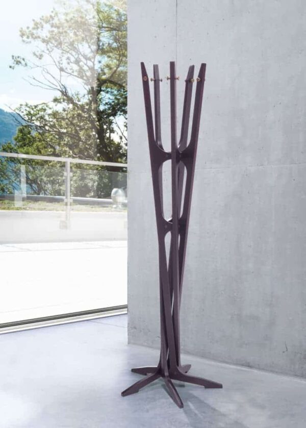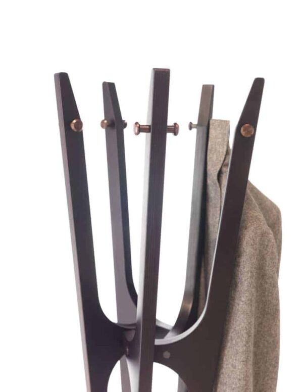 Perchero realizado en madera multicapa teñida color ebano, con pomelos de metal torneado color bronce.