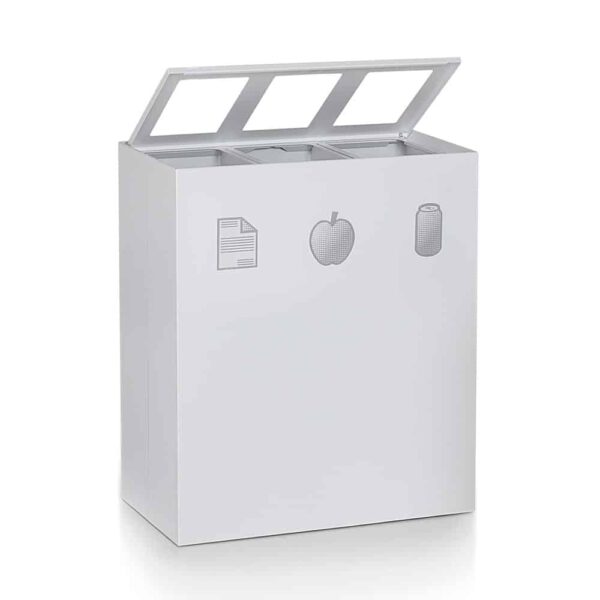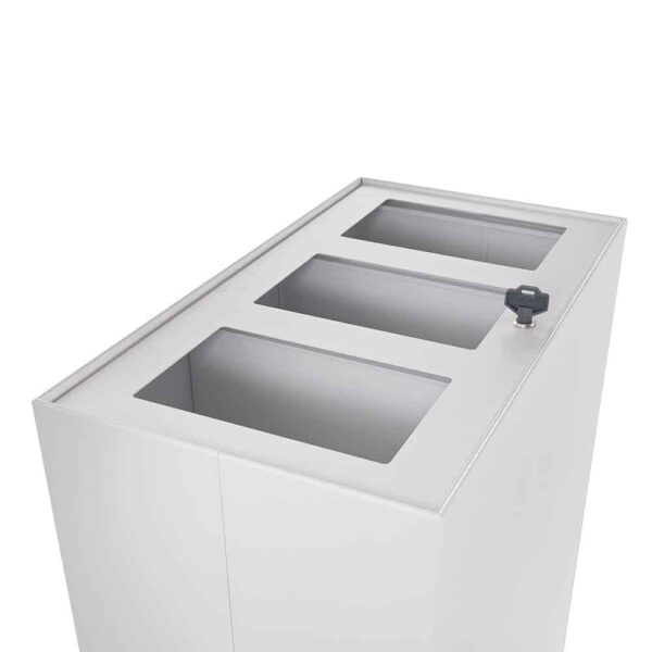 Contenedor concebido para la recogida selectiva de residuos realizado en acero pintado con polvos epoxi, equipado con una única tapadera, que dispone de cerradura y llave para garantizar que la apertura se realice solo por parte del personal autorizado.