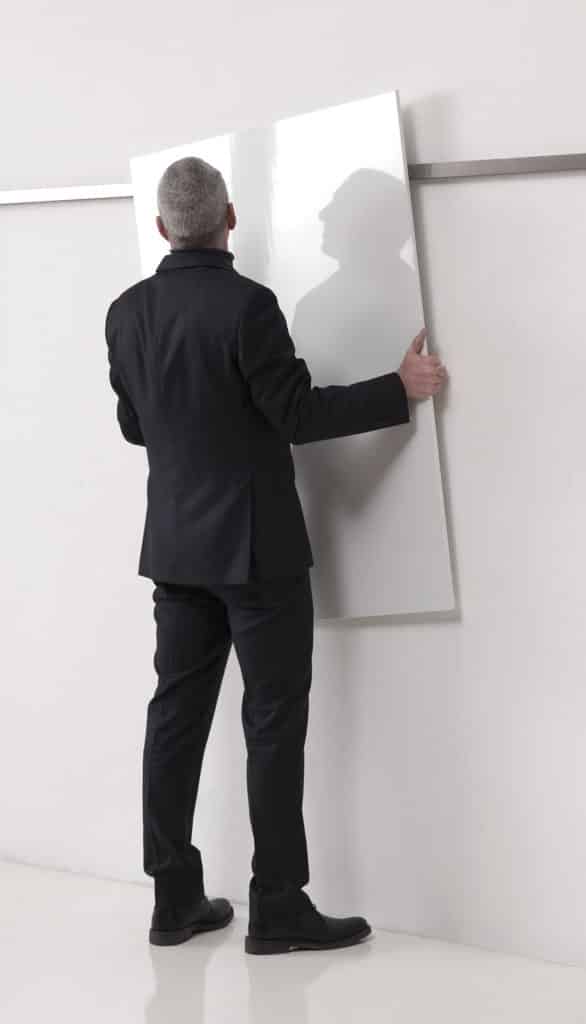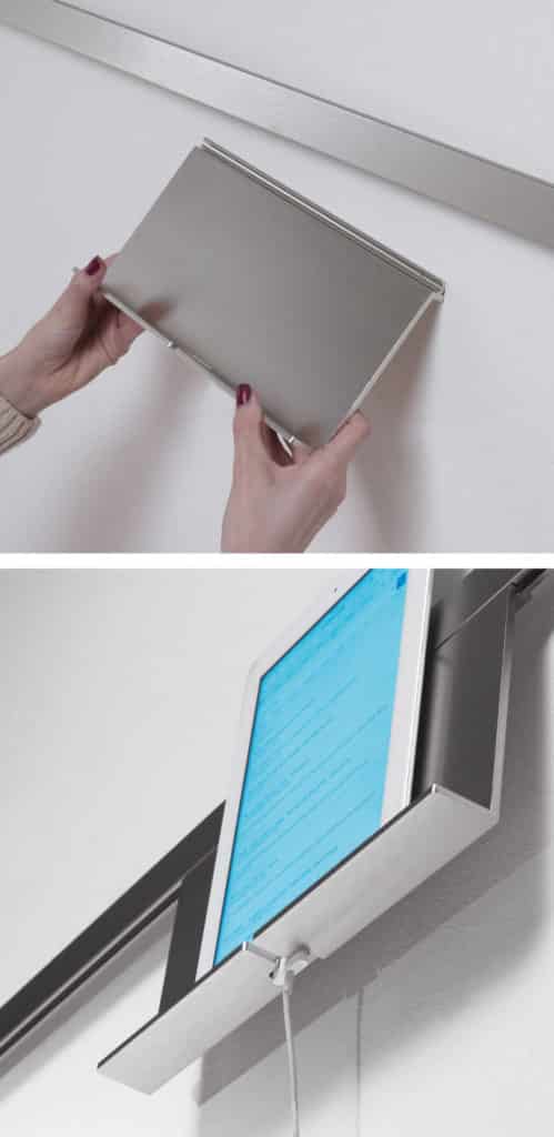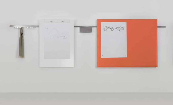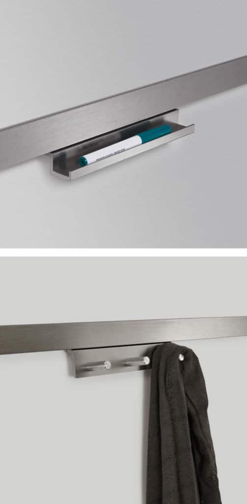 Colección de accesorios para salas de reunión compuesta por un marco de pared expansible en aluminio satinado donde colgar porta tabletas, portaobjetos, portatrajes, pizarras de laminado y paneles fonoabsorbentes Snowsound.