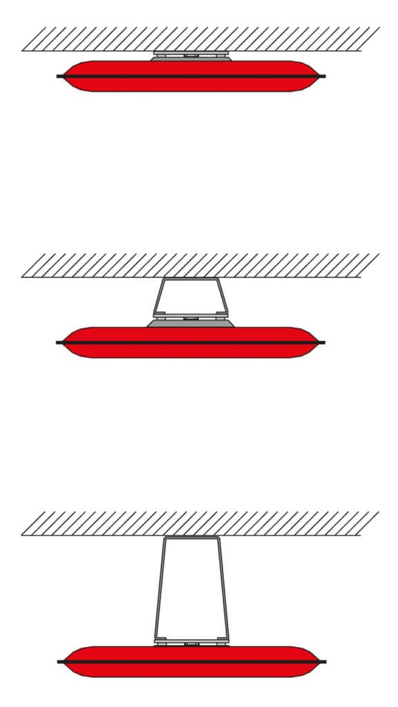 El panel acústico de techo Mitesco, fabricado con tecnología Snowsound, está equipado con un perfil de nivelación y accesorios que permiten la fijación directa al techo o a soportes de acero que mantienen el panel separado del techo para optimizar su rendimiento acústico. Las cubiertas frontales de los accesorios están hechas de metal del mismo color que el panel.