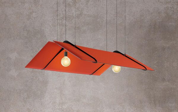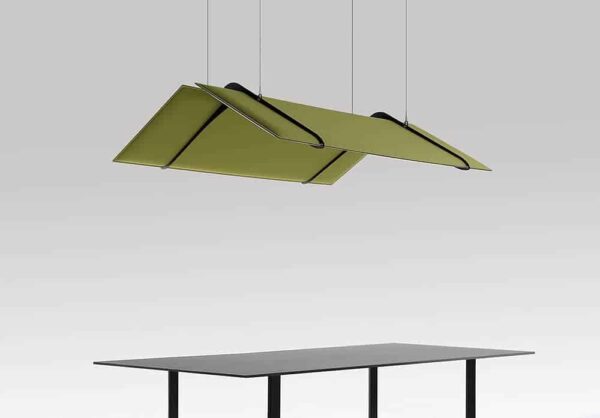 Pantalla fonoabsorbente que se puede convertir en la pantalla de una lámpara. Su estructura de acero barnizado sostiene dos paneles Snowsound disponibles en diferentes tamaños. Los paneles están colocados de forma inclinada, con espacio entre sí para permitir el paso de la luz. La altura de los cables de sujeción es ajustable.