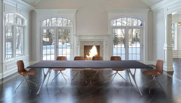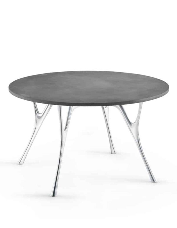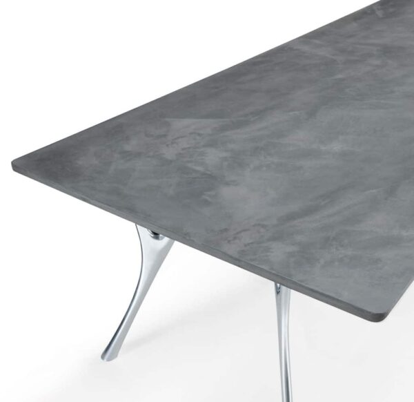 Un diseño riguroso para la mesa Pegaso, estudiado para conseguir grandes dimensiones y propuesto con plano en composito extremadamente ligero, con estructura a “sandwich” que consiste en un núcleo hecho de láminas de madera encerrado entre dos hojas de aluminio recubierto por la parte superior y en los bordes con una lámina de resina acrílica blanca cepillada o recubierto en hormigón donde la artesanía del trabajo hace que cada pieza sea única y exclusiva. La simplicidad y las líneas limpias del plan tanto en la versión de cemento que de resina, contrasta con las formas sinuosas de la estructura, fabricado en aluminio pulido o recubierto.