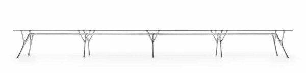 Mesa con estructura de aluminio y superficie de vidrio templado y pulido transparente. El enganche de las superficies a la estructura se realiza mediante discos especiales de acero inoxidable que están pegados a la superficie.