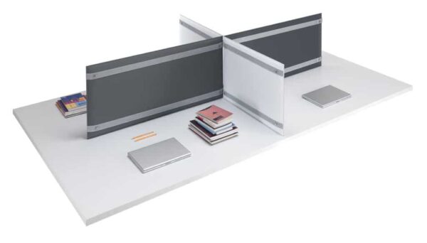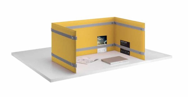 Los paneles fonoabsorbentes Pli se pueden usar también como divisorio para el escritorio, garantizando confort acústico, privacidad y mucha flexibilidad de configuración gracias a las correas elásticas que enlazan los paneles con diferentes ángulos y uniones en “T”, en “L” o en “X”.