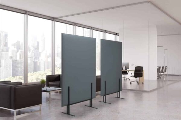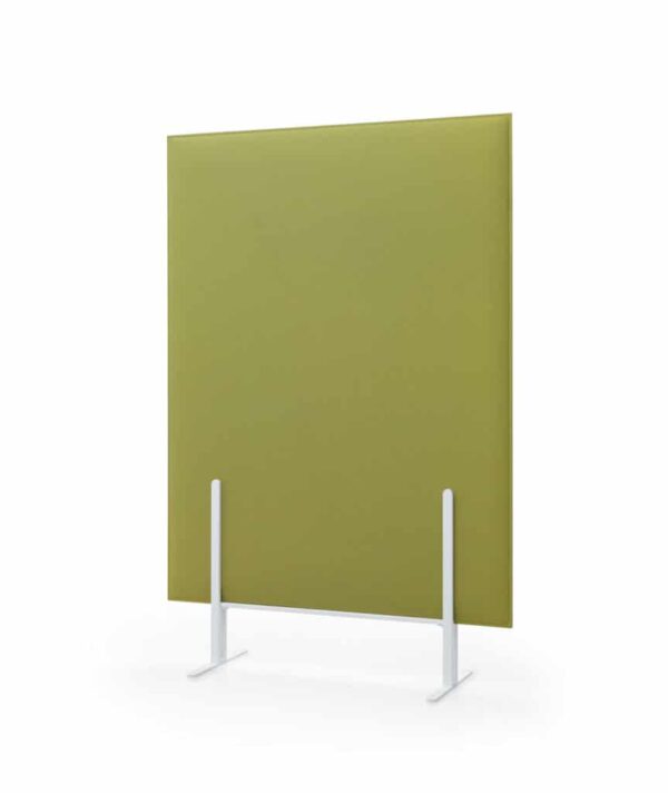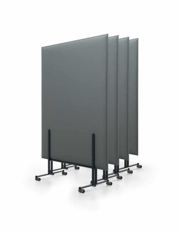 Las mamparas divisorias Pli Over, realizadas con tecnología Snowsound, están disponibles en dos versiones: una con base de soporte autónomo, y la otra con base dotada de ruedas que permiten una gran flexibilidad de desplazamiento en el espacio.