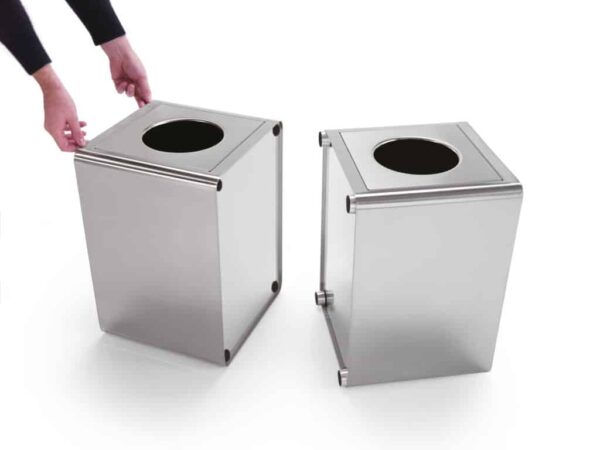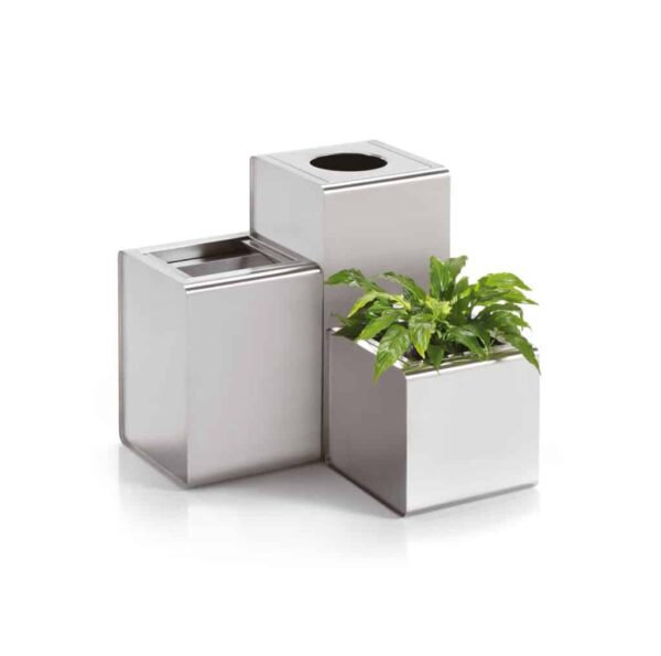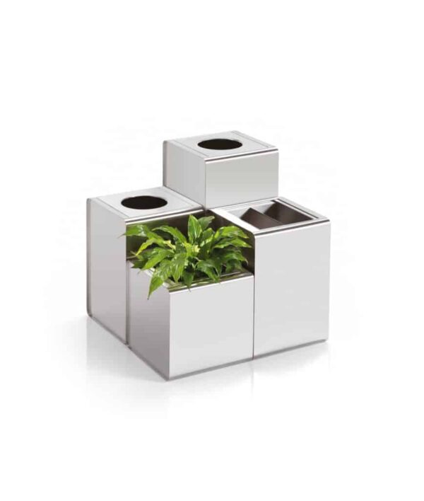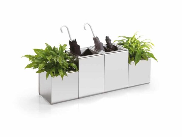 Un innovador y elegante sistema de accesorios contenedores formado por paragüeros para paraguas clasicos como para los plegables, ceniceros, papeleras y macetas. Disponible tambien completamente de acero inoxidable AISI 304 aptos para su uso en exterior con un fondo perforado para dejar que pase el agua de lluvia. Puede fijarse al suelo.