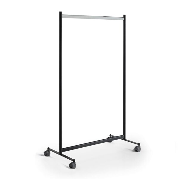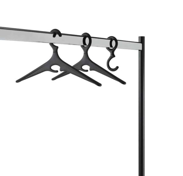 Perchero de barra que presenta una estructura de acero barnizado con polvos epoxi, con barra para colgar en acero cromado y ruedas realizadas en tecnopolímero. Los montantes verticales superan levemente la altura de la barra, de manera que sujetan lateralmente las perchas.