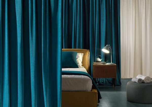 Cortinas realizadas con tejidos fonoabsorbentes Snowsound Fiber, hechas a medida según las especificaciones del cliente.