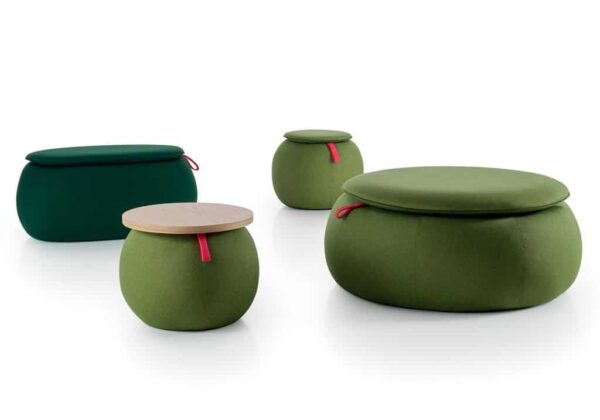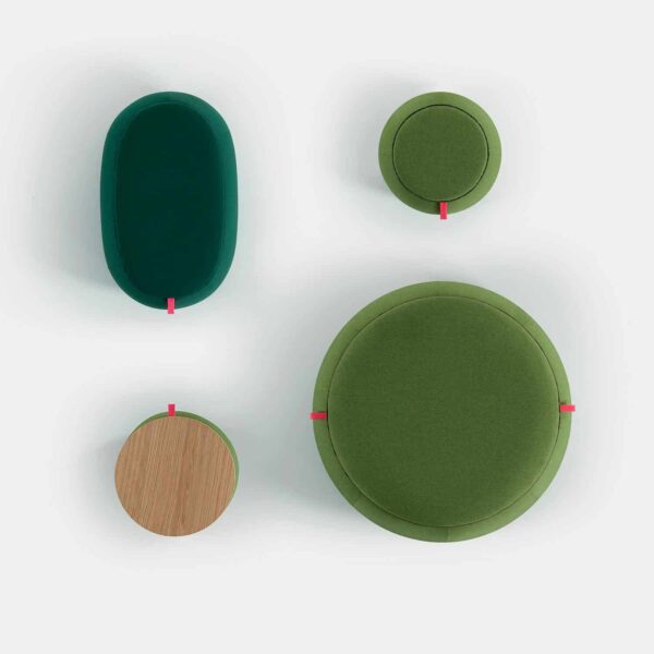 Confortables elementos fonoabsorbentes, tapizados con tejido Snowsound Fiber 3 Melange, compuestos con un relleno de tecnopolímeros fonoabsorbentes y material derivado de la madera. La colleción Snowpouf incluye puf de varias medidas y una mesita de café con tablero de madera de roble claro. Snowpouf se puede desplazar fácilmente gracias a una elegante cinta de tela. En las versiones de una plaza, dos plazas, ovalado y mesita, Snowpouf se propone también tapizado con los nuevos tejidos Snowsound Fiber 12 ECONYL®.