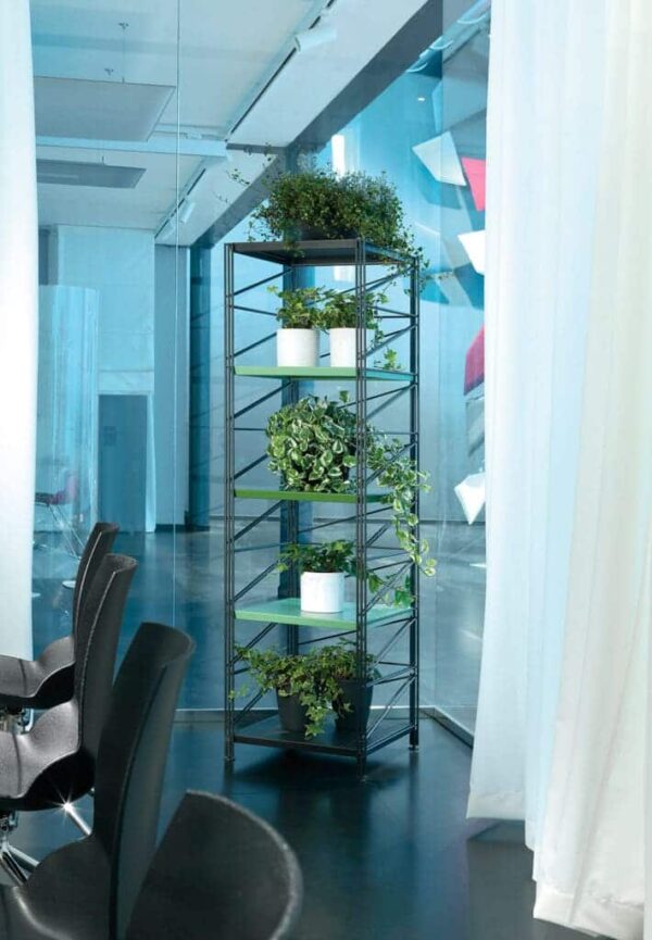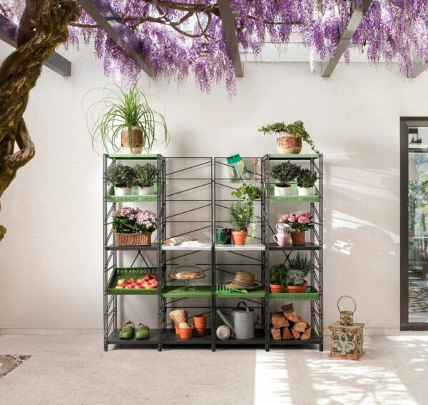 Socrate Outdoor es un sistema modular de decoración para exteriores, concebido como elemento versátil que incorpora diversos accesorios para resultar más funcional a los diferentes espacios, tanto de pequeño como de gran tamaño. Consta de una estructura básica con montantes, crucetas y rejillas de acero galvanizado y pintado y de estantes de metal, mármol, repisas porta macetas, rejillas y contenedores de acero inoxidable o galvanizado y pintado. Se pueden combinar los diferentes colores de las estructuras, estantes y accesorios para conseguir un efecto cromático original.