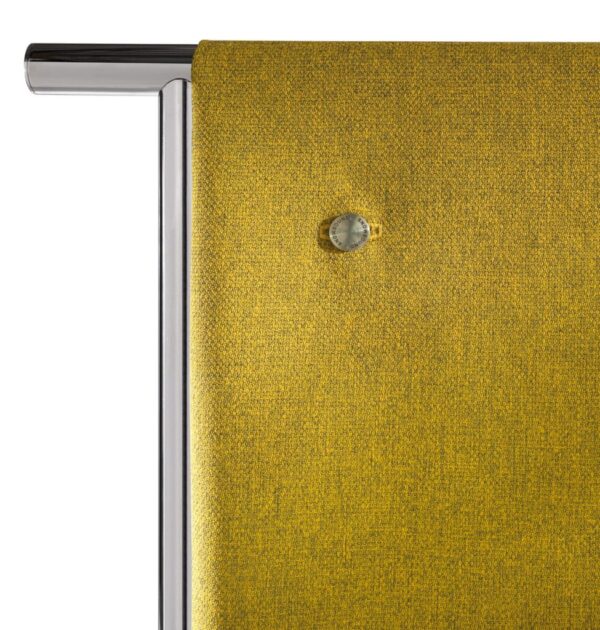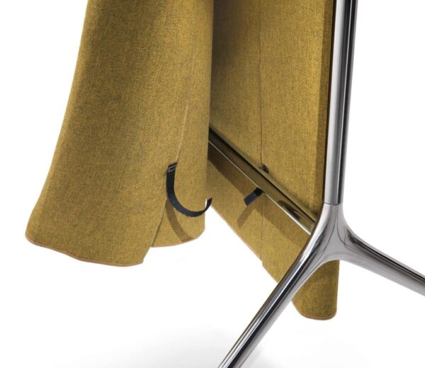 Mampara móvil que se caracteriza por su base de aluminio brillante montada sobre ruedas con freno, tejido de poliéster fonoabsorbente Snowsound Fiber Textiles 3. El sistema es desenfundable.